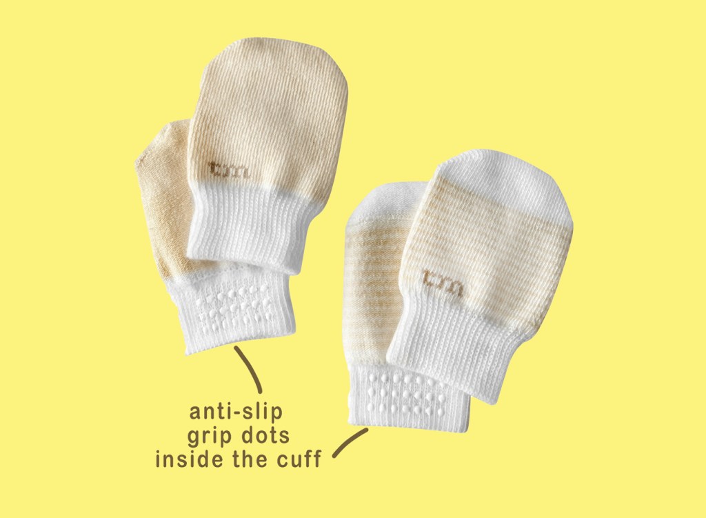 Features gentle, skin-safe grips inside the cuffs to ensure the mittens stay securely in place on even the most active little hands.